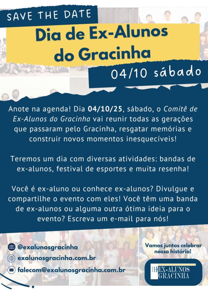 No dia 04/10/25, das 10h às 18h, acontecerá o primeiro Dia do Ex-Aluno, evento voltado aos ex-alunos, ex-professores e ex-funcionários do Gracinha de todas as gerações.